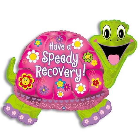 This foil balloon is a cute and easy way to wish someone a speedy recovery! The turtle-shaped balloon is jumbo in size, measuring 31 inches tall when inflated with helium. Turtle is green with a hot pink shell adorned with bright flowers. The words Have a speedy recovery! is written on the turtle shell.
