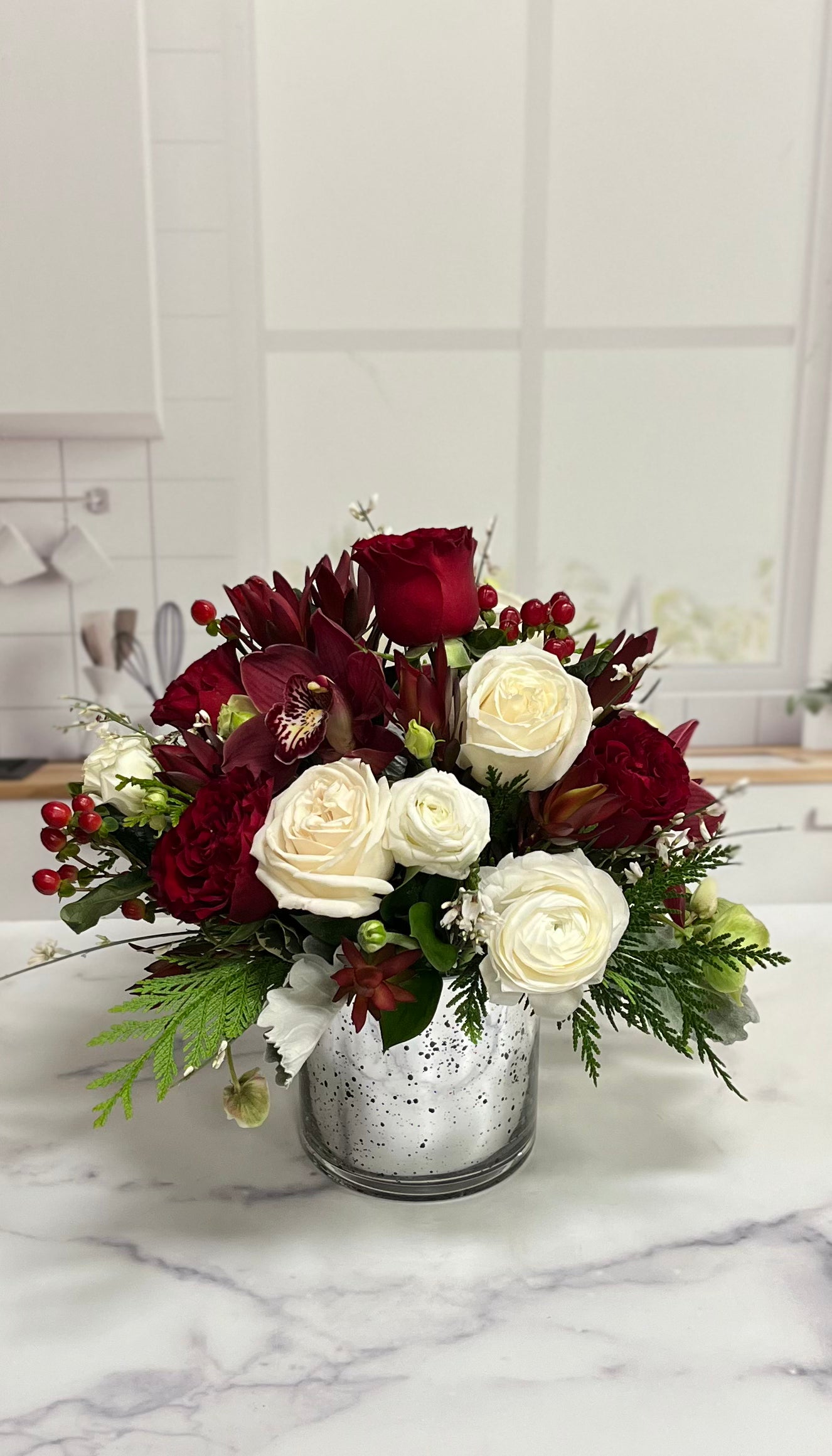 Elevate any space with the timeless beauty of Crimson Ivory Glow. This luxurious arrangement blends rich, velvety crimson blooms with creamy ivory roses to create a striking, romantic contrast. Accented with seasonal greenery, textural berries, and elegant floral details, it sits in a modern silver-speckled vase that adds a soft, luminous glow.