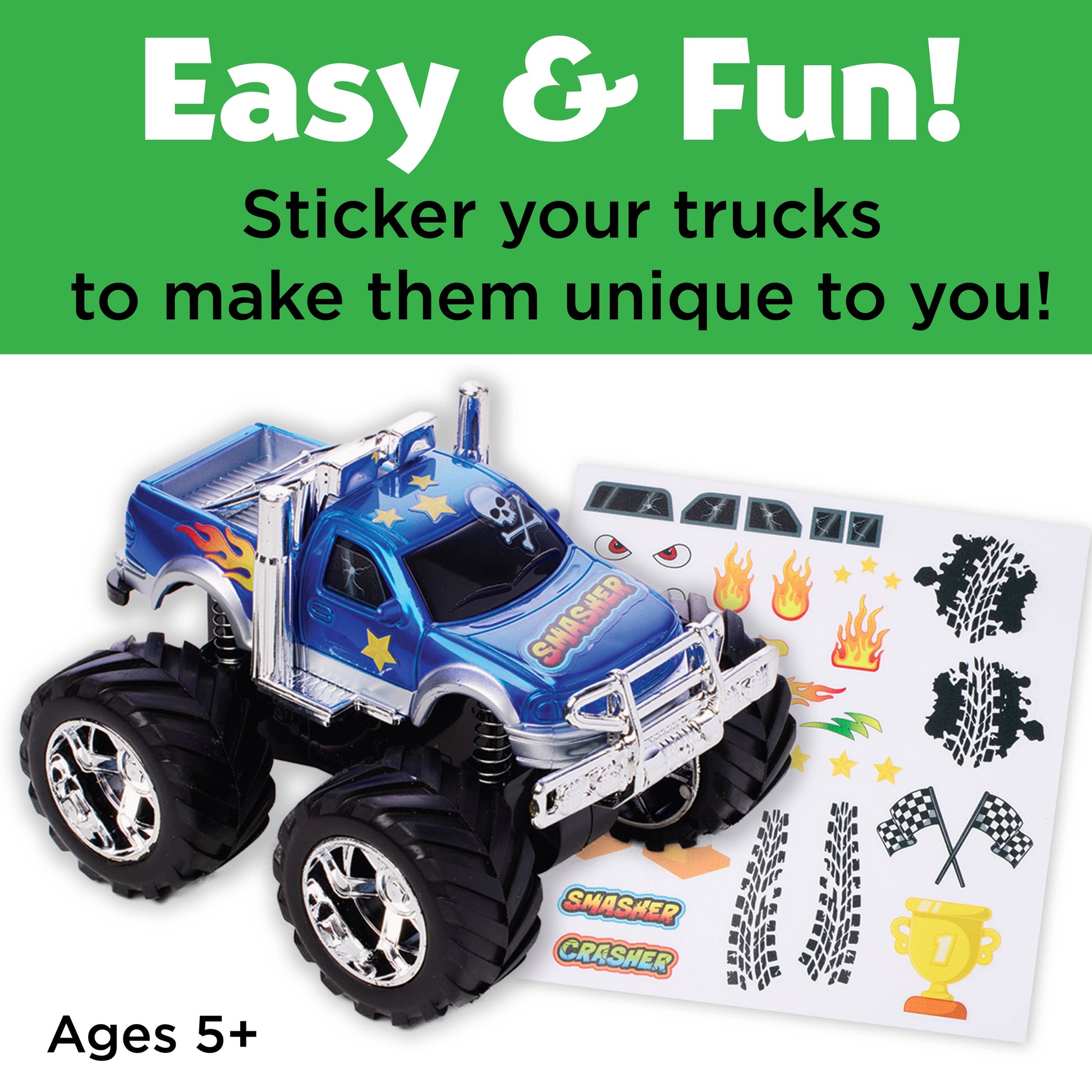 Customize and design your own monster trucks! The Creativity for Kids Monster Trucks kit comes with 2 different trucks ready to decorate. Customize your fleet and make them completely unique to you. Save the box, pop out and fold the ramp! Rev up your trucks and watch them race, roll and flip. These monster trucks measure 4.5" w x 4" h each. Ages 5+
