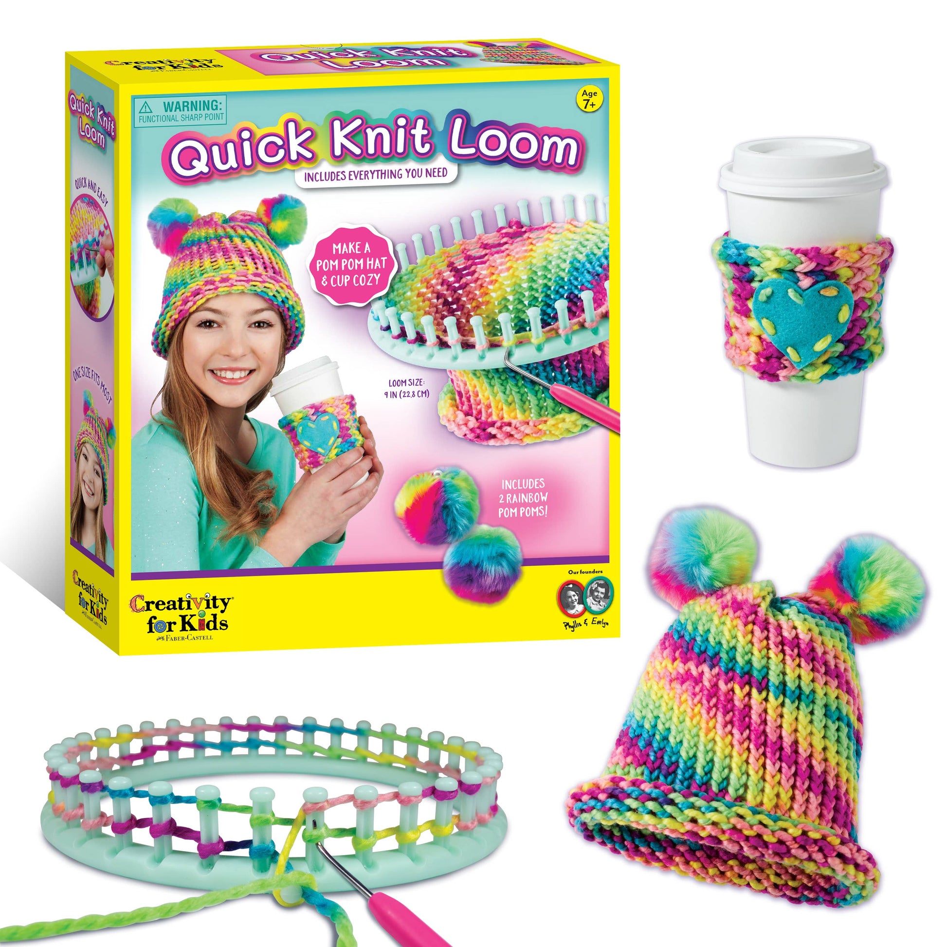 Knit your own rainbow pom pom hat and cozy! Kids knitting kit is great for beginners with easy to use tools and loom! Craft kit includes chunky rainbow yarn, faux-fur pom poms, easy-to-use tools and fun accessories A calming and educational craft activity! The repetitive motions of knitting provide a mindful and enjoyable experience that builds critical thinking skills, fine motor coordination, math, comprehension, planning and problem solving Loom knitting is an easy weaving technique! Quick Knit Loom kit comes with illustrated instructions and a how-to-video that provides a step by step guide on completing this loom knitting craft. It is a great craft for kids ages 7+ Build creative confidence and entertain with at home and indoor activities for kids! Quick Knit Loom kit is a unique way to unplug, unwind and have fun while learning a new crafting skill
