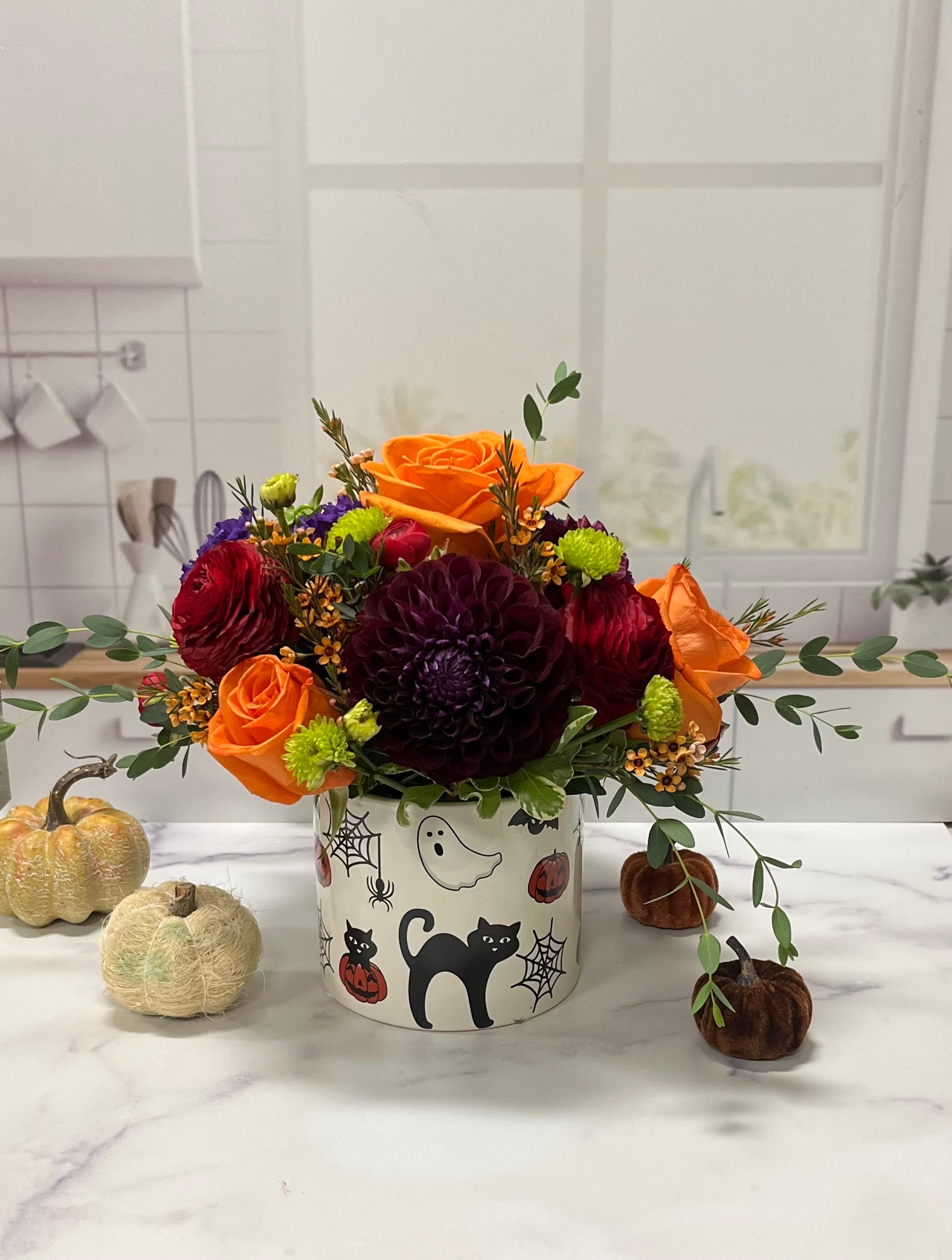Bring a touch of spooky charm to your home with our Fall Chills arrangement! This festive mix features vibrant orange roses, deep burgundy dahlias, and pops of lime green accents, all artfully arranged in a playful Halloween vase decorated with black cats, pumpkins, ghosts, and spiderwebs. Perfect as a centerpiece for your Halloween party or a cheerful seasonal gift, this arrangement blends elegance with a little Halloween mischief.