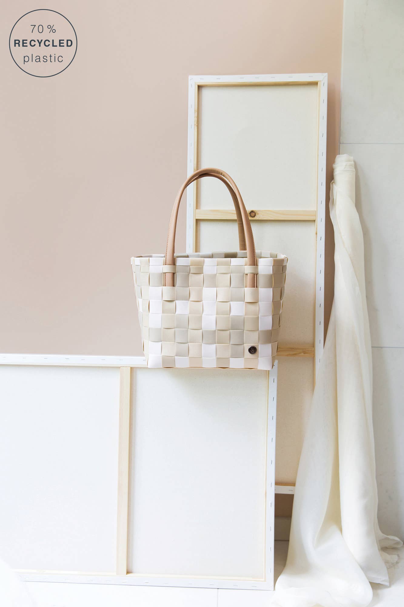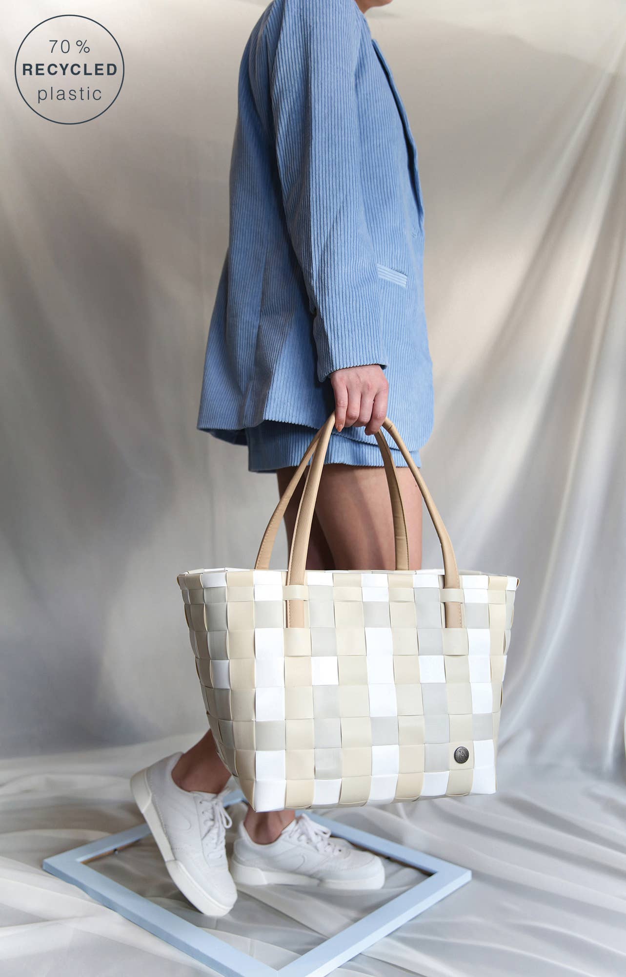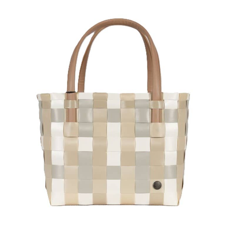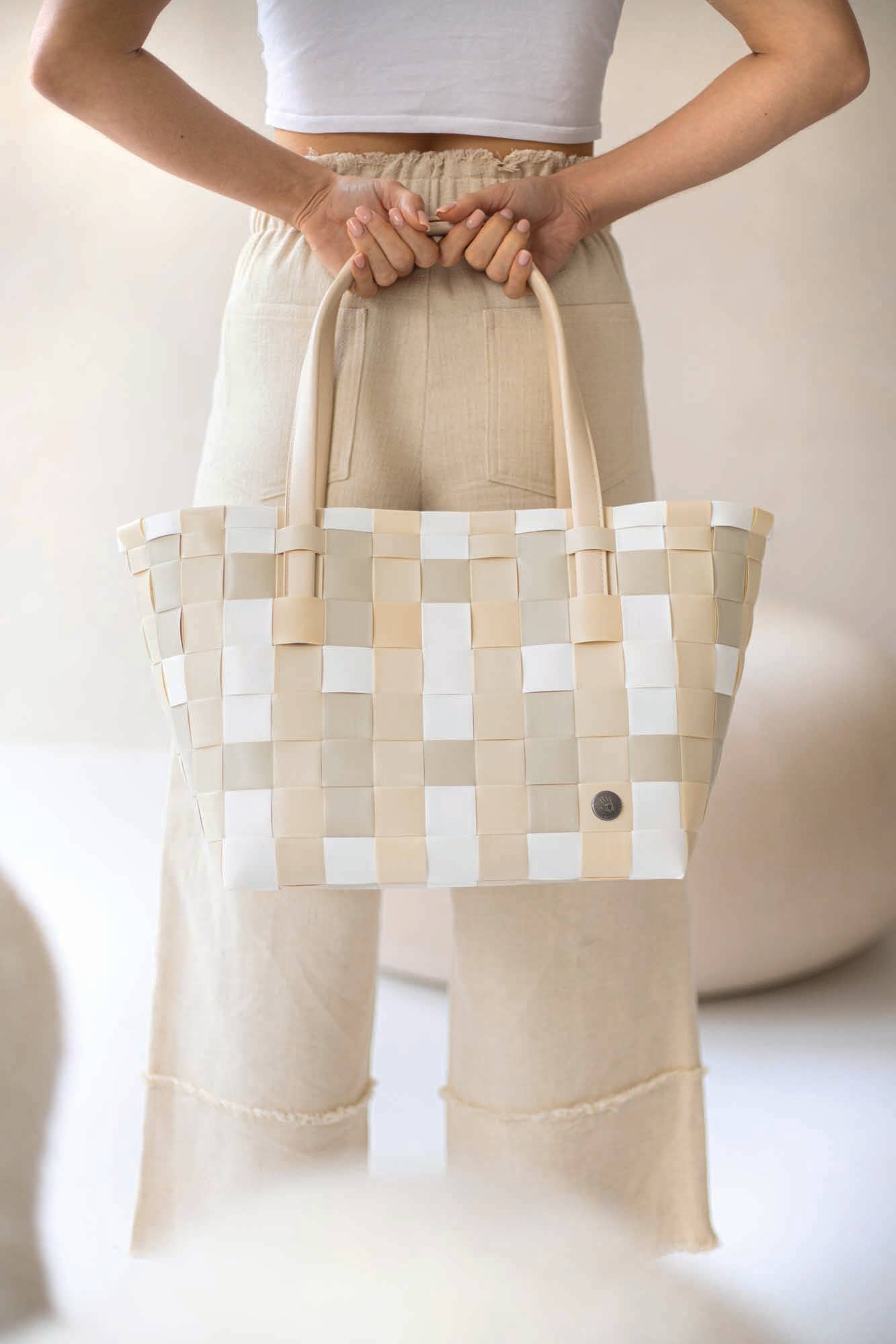Designed in Europe, made of recycled plastic, handwoven by gifted artisans, lightweight and elegant, cleans easily with soap and water, stand up design, easy to load and unload, multipurpose totes for every occasion. Features faux-leather soft comfort handles.