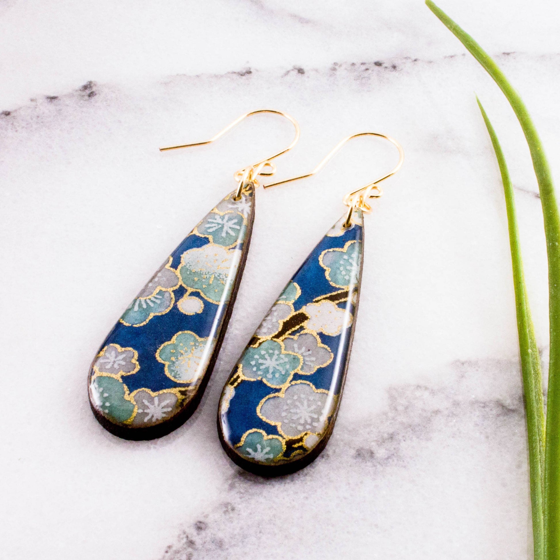 Handcrafted from sustainably harvested maple wood, vintage Japanese papers, glossy, vegetable-based resin, and handcrafted gold-filled ear wires.