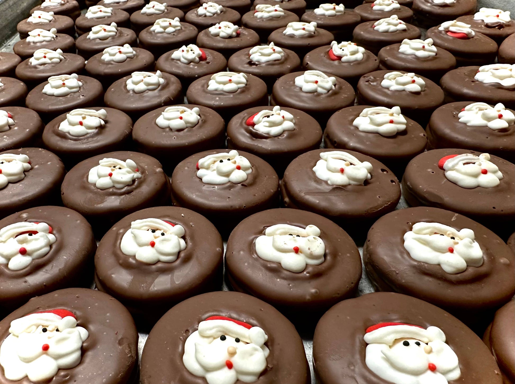 Smiling Santa! We take a classic Oreo Cookie & enrobe this is in our pure milk chocolate blend. We decorate each with an edible Santa Face seasonal decoration. Each item has three O'Oreo's in pack and a very popular impulsive seasonal item. These merchandise well in baskets. Use these to bring some seasonal color & theme to your displays. Intricate design.