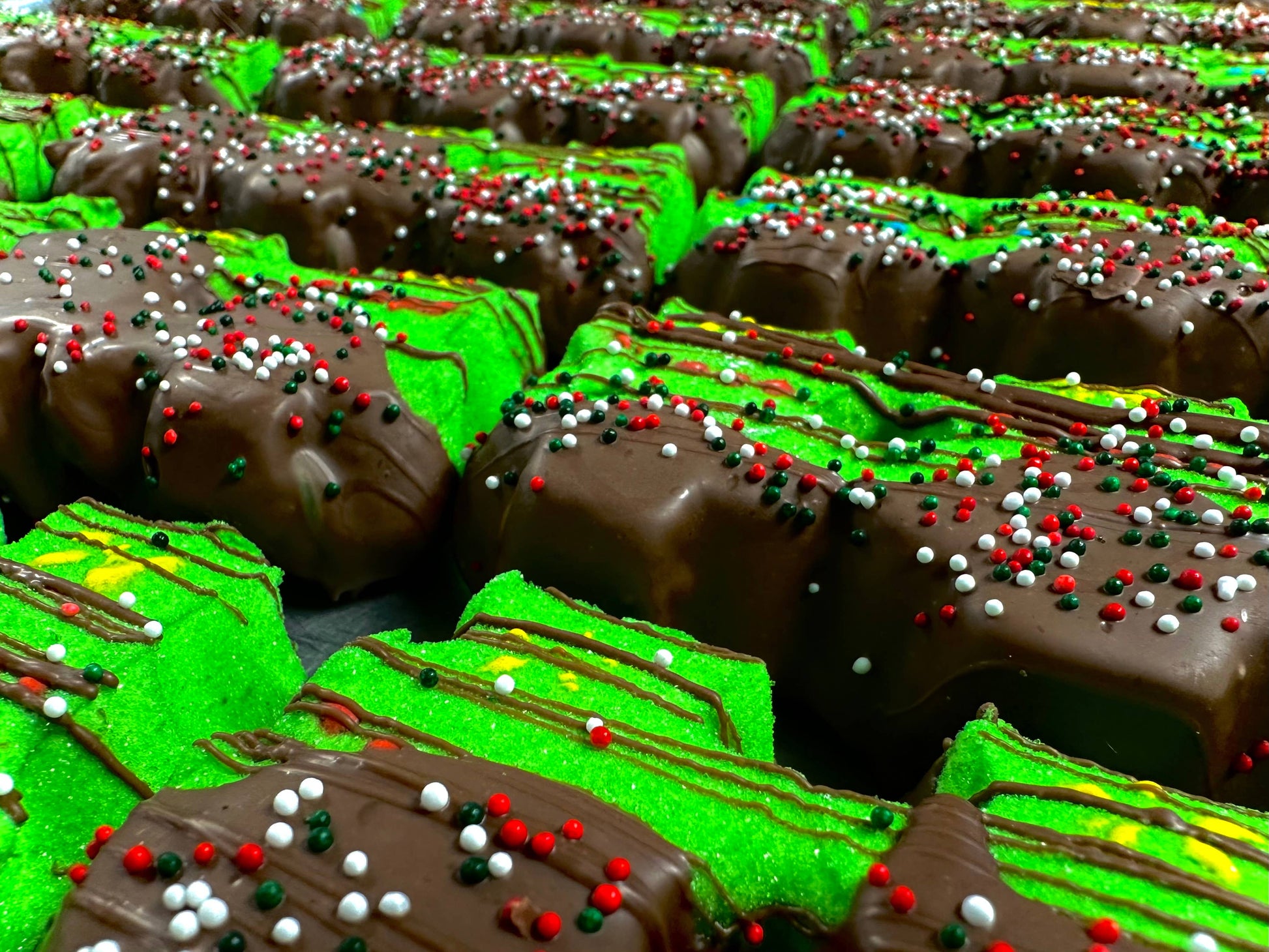 Indulge in the festive spirit with our chocolate-dipped marshmallow Christmas cutouts! Each delightful treat features fluffy marshmallows shaped into holiday-themed designs, such as snowmen, Christmas trees, and Gingerbread Man. Coated in rich, velvety chocolate, these sweet confections are then decorated with colorful sprinkles and edible glitter, adding a touch of whimsy and joy to your celebrations.