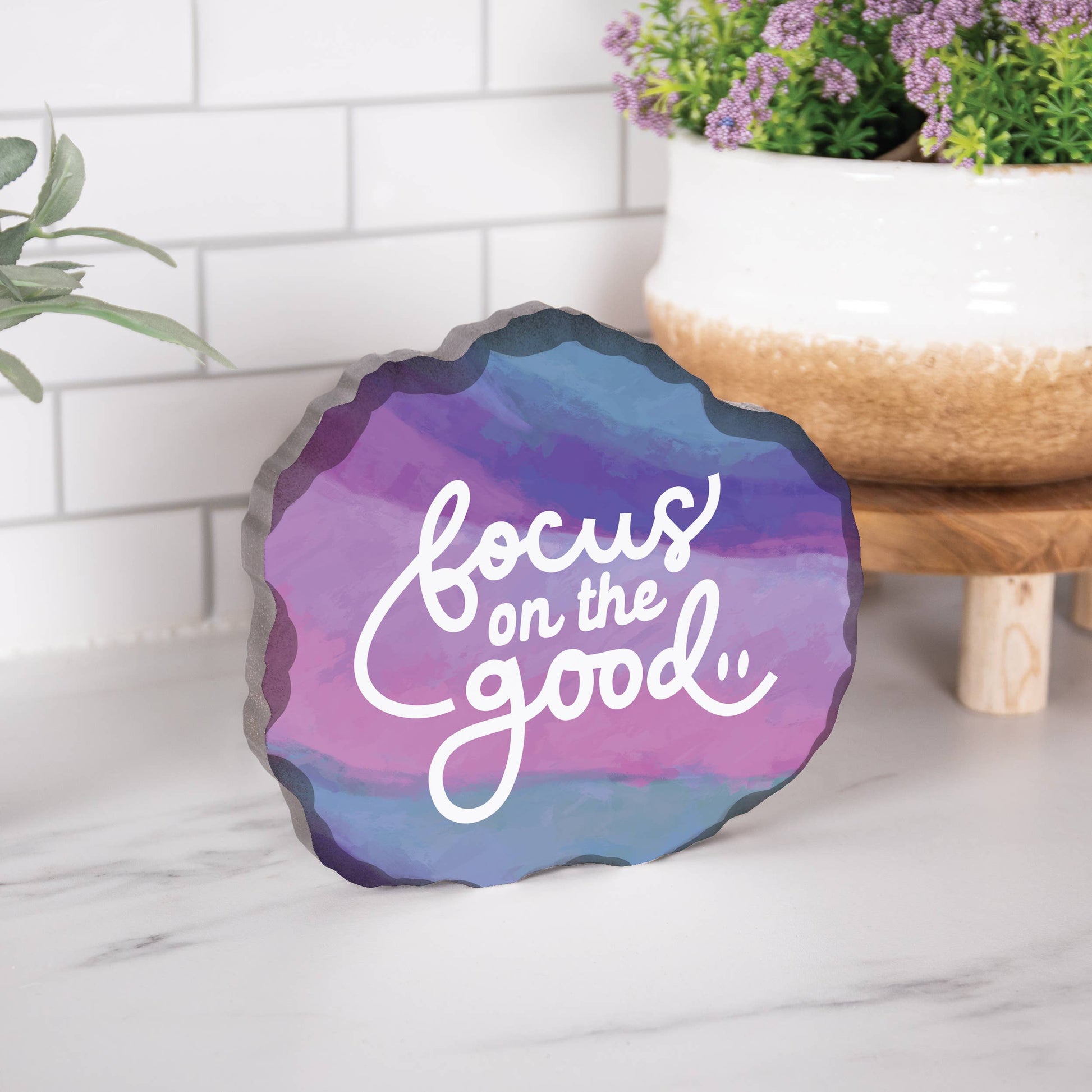 Unique tabletop signs that feature rigid, detailed edgework to convey the look and feel of actual rock. The application of bold colors and inspiring sentiments make these faux geodes truly novel.
