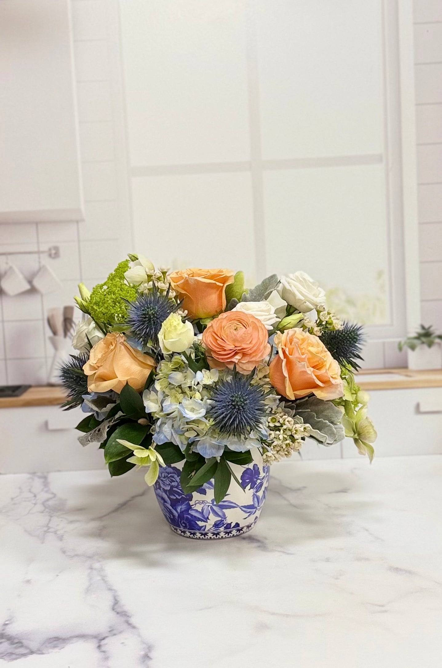 A fresh, spring-inspired arrangement featuring soft peach roses, delicate ranunculus, airy blue thistle, and seasonal greens arranged in a charming blue-and-white vessel. Light, cheerful, and perfect for celebrating the beauty of the season.