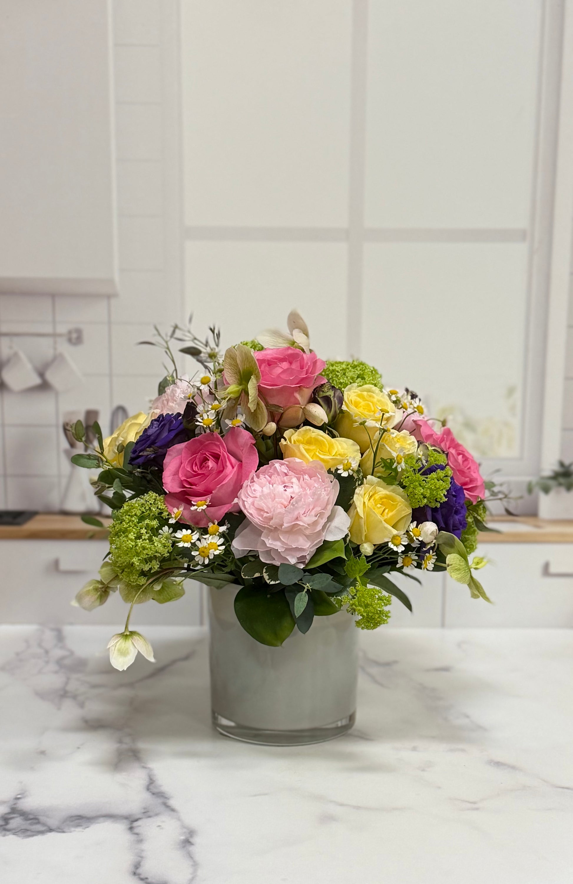 A soft and cheerful spring arrangement featuring pastel pink, yellow, and purple blooms nestled in lush greenery, beautifully arranged in a classic white vase. Fresh, elegant, and perfect for celebrating the season.