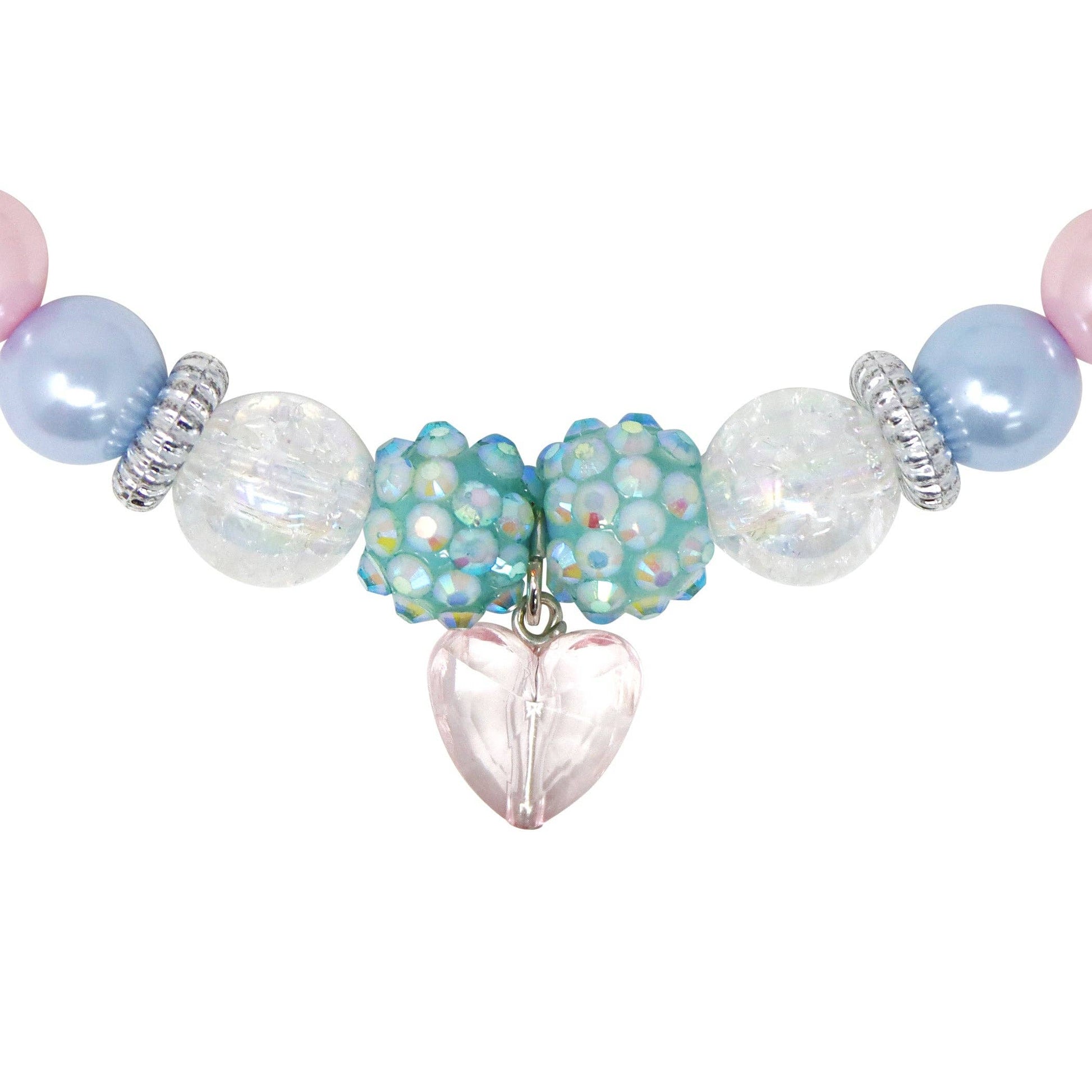 For a beautiful ice princess, this 2 piece set is comprised of an assortment of icy blue and pale pink pearls, and features a dangling pink ice heart charm. Size: Necklace 16 inches, Bracelet 6 inches Style: 2 piece stretch elastic set