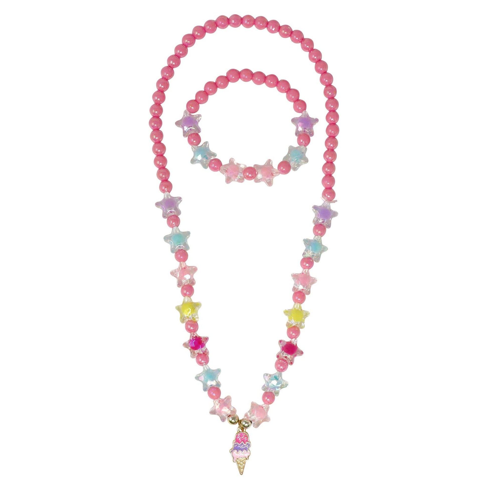 Pink Poppy's Ice Cream Necklace & Bracelet Set is a sweet treat. The elastic necklace & bracelet set is created from glossy iridescent transparent pastel star and pearl beads. This necklace also comes with a metal charm of enamel-painted ice cream.