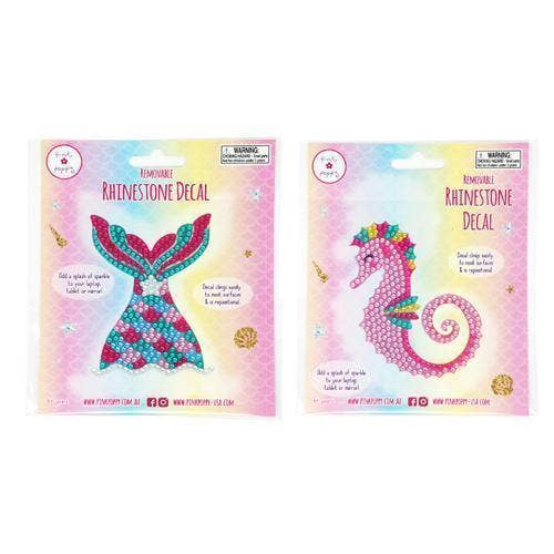 Decorate your books, bags, locker and more with Pink Poppy's removable rhinestone decals. . Removable and reusable. Available in Mermaid and Seahorse designs. To remove, simply peel off. This decal can be reapplied and reused. .. Size 5.1” x 6.2”