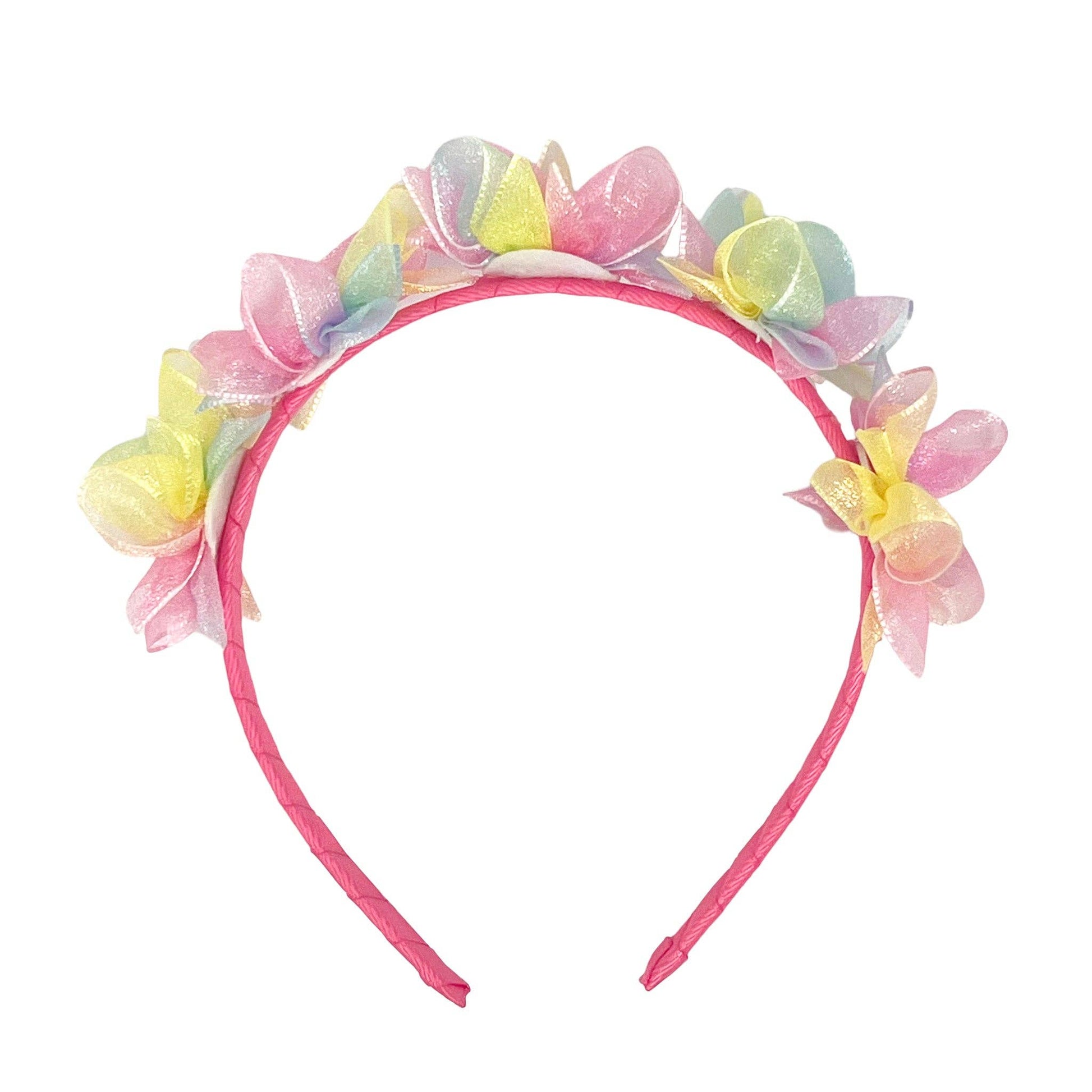 With sheer rainbow fabric flowers, embellished with a pearl centrepiece the headband is covered in a bright pink fabric for comfort.