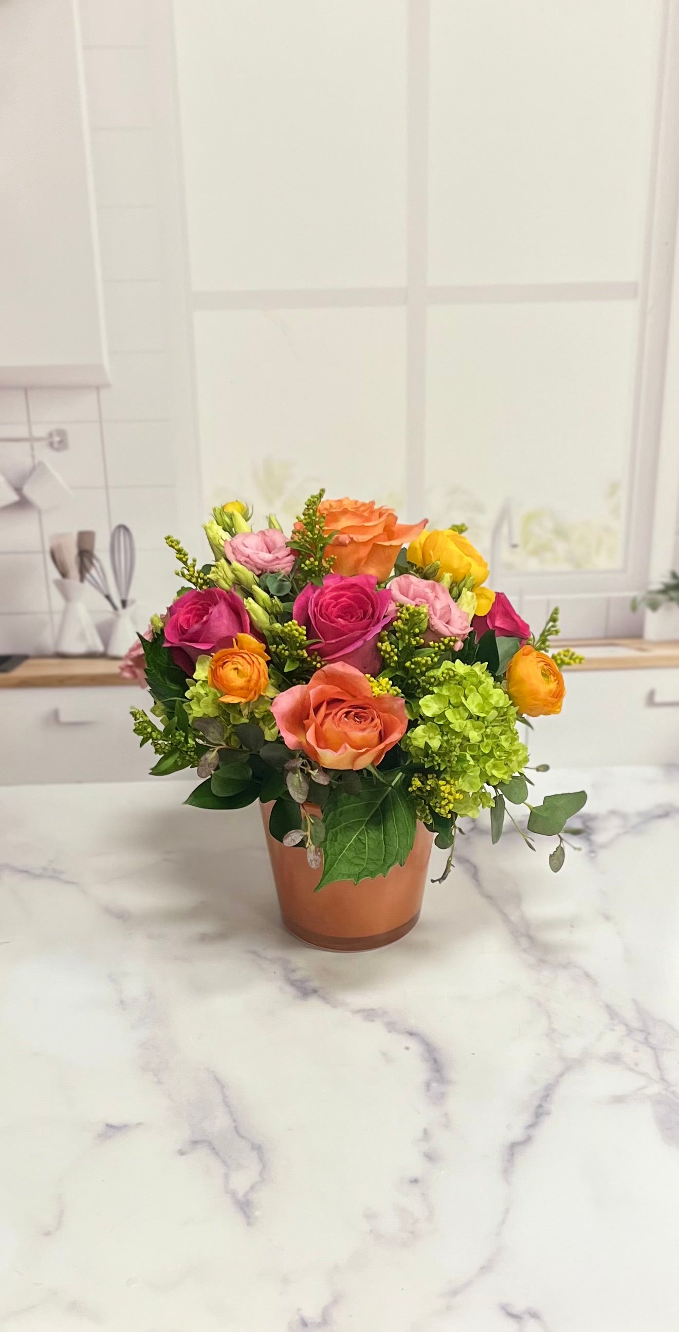 Bursting with warmth and color, sun kissed garden is a radiant arrangement that captures the golden glow of a summer sunset. Featuring lush roses in shades of hot pink and coral, delicate ranunculus and lisianthus in buttery yellows and soft peaches. This piece is a joyful celebration of natures most dazzling hues.