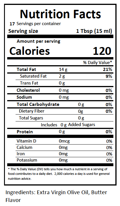 Enjoy the flavour of butter with the health benefits of extra-virgin olive oil. This smooth buttery oil is naturally infused with the rich flavor of butter. This a simple way to cut back on saturated fats, sodium and cholesterol in your diet without sacrificing the flavour.