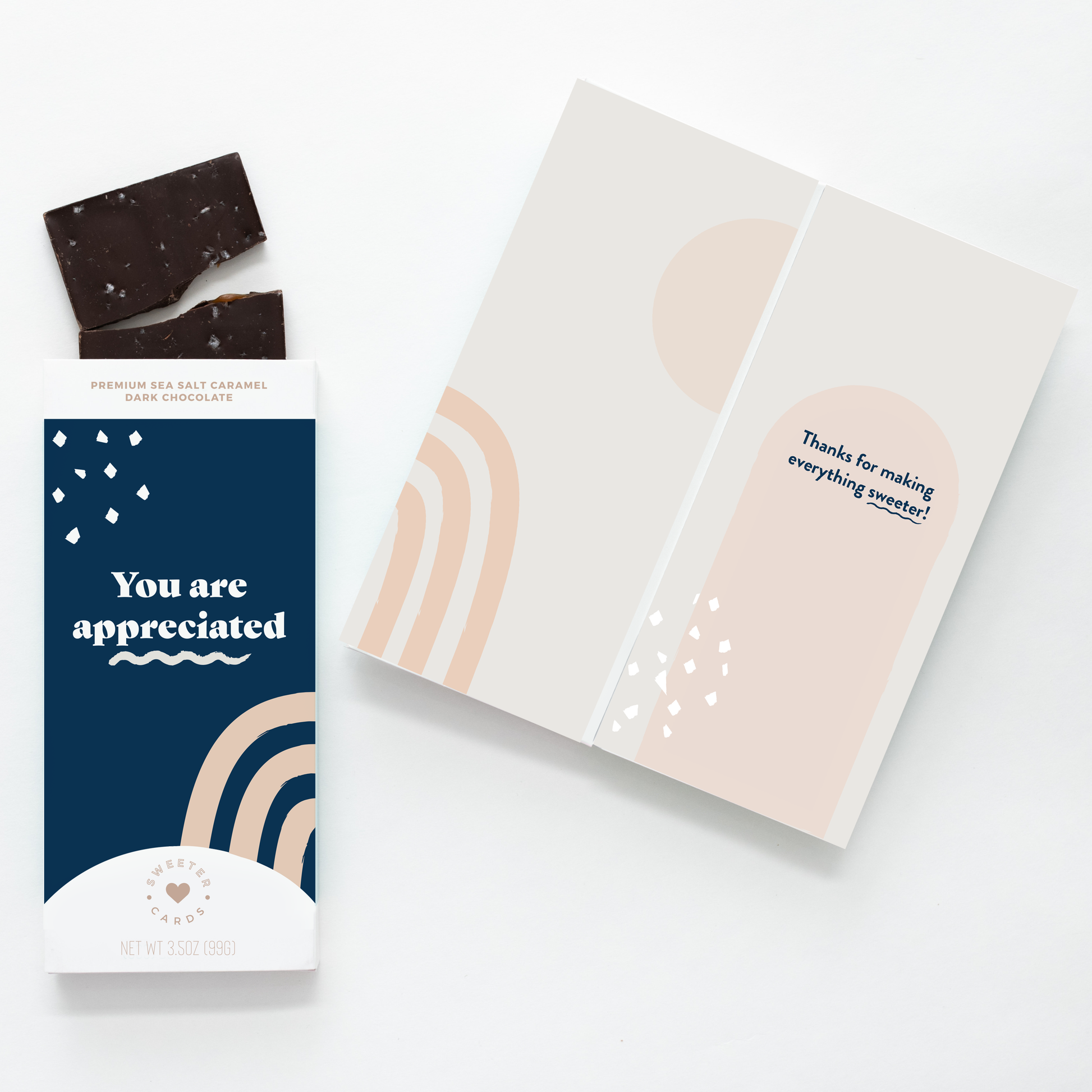 This "You are Appreciated" design is new and perfect for everyday gratitude, employee or client gifting, and more. If you're looking for the best chocolate bars and a clever two-for-one gift, you'll love our chocolate-filled greeting cards! Candy and card lovers especially ;)