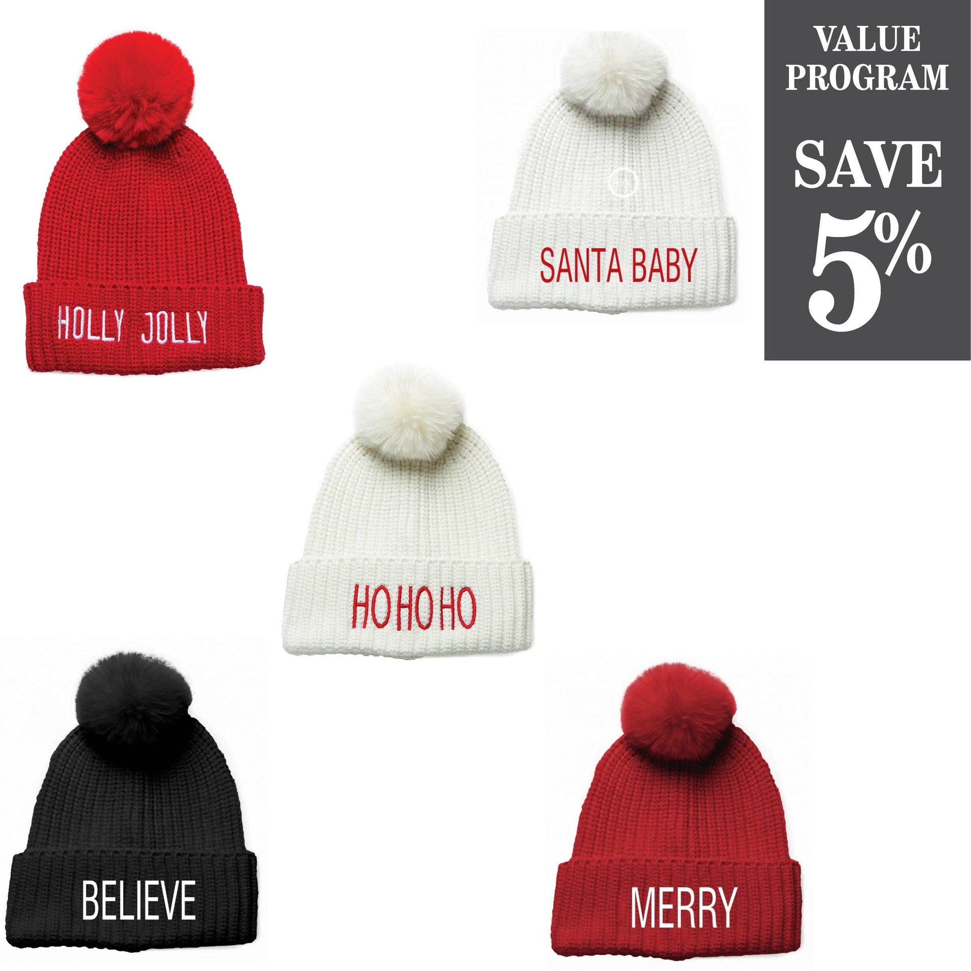 Fun and warm, stitched with HOHOHO, SANTA BABY, MERRY, BELIEVE or HOLLY JOLLY, the Joyce hats are a great choice for the holidays. Wear with our Holly ponchos! Great gift idea!