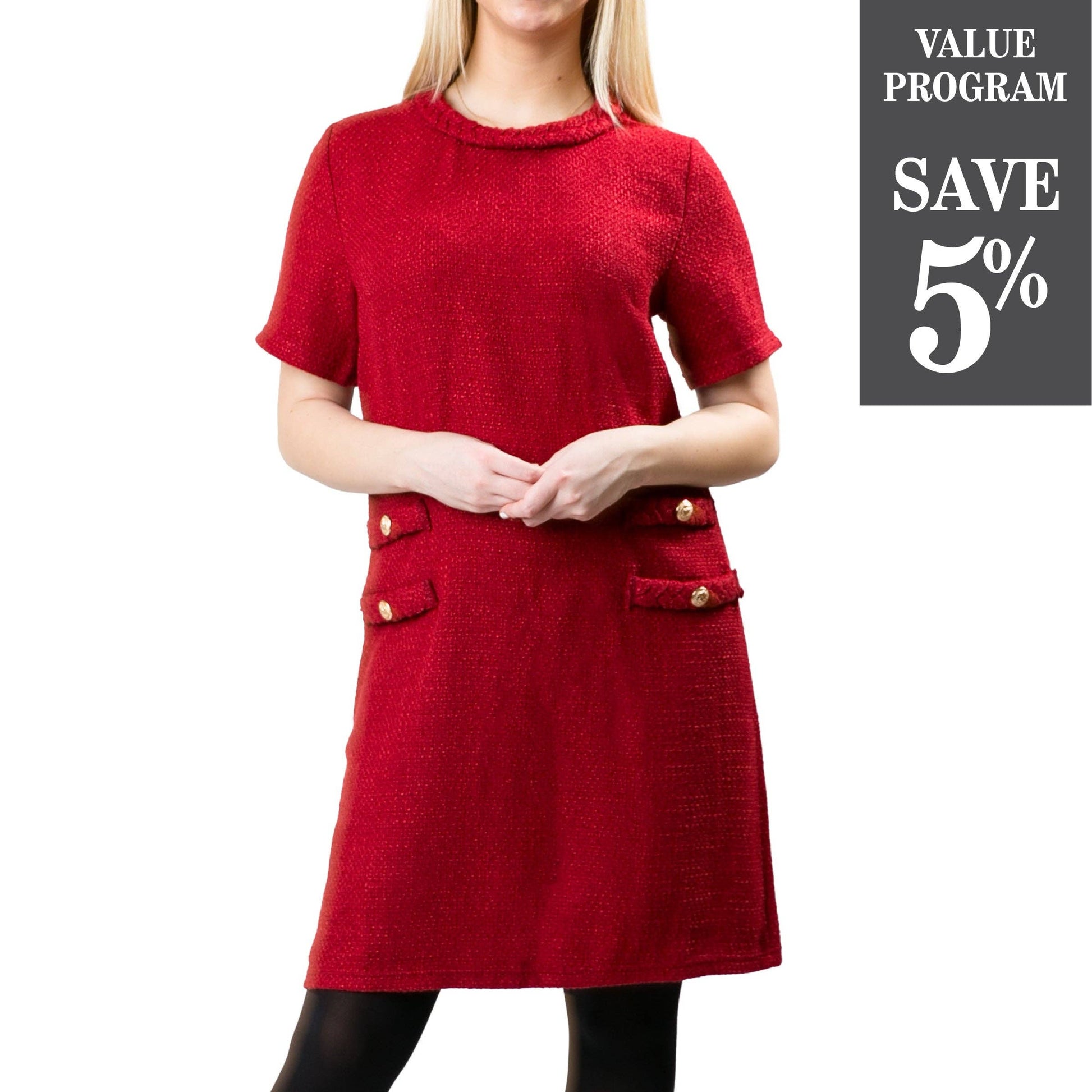 A new dress with a classic and stylish look! This short sleeved sheath dress flatters everyone! Accented with textured fabric, decorative double braided bands with gold buttons on front hips and braided neckline. Perfect with tights and booties, heels or casual flats. Model is 5'8" and wearing a size Medium
