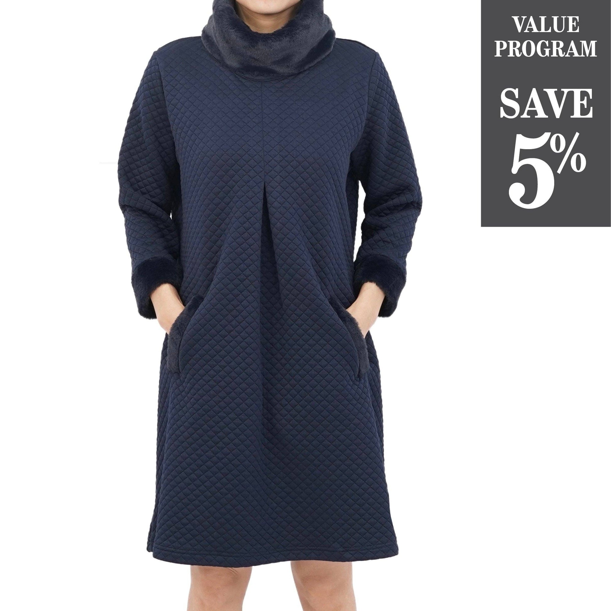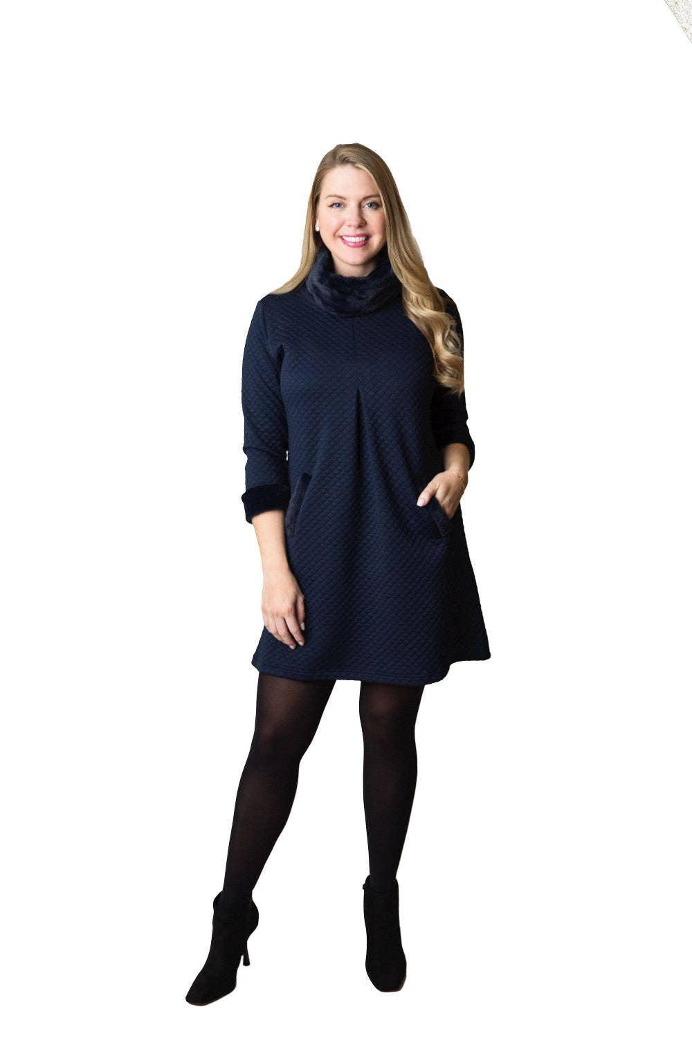 The Rhiannon is an update to everyone's favorite Meghan dress: quilted body with faux fur accents on the turtleneck and cuffs. This dress flatters every body! And she has pockets! Three quarter sleeves, front pleat and loose-fitting turtleneck. Perfect with tights and booties, or over leggings with your favorite sneakers. Stretch jacquard fabric. Model is 5'8" and wearing a size Medium